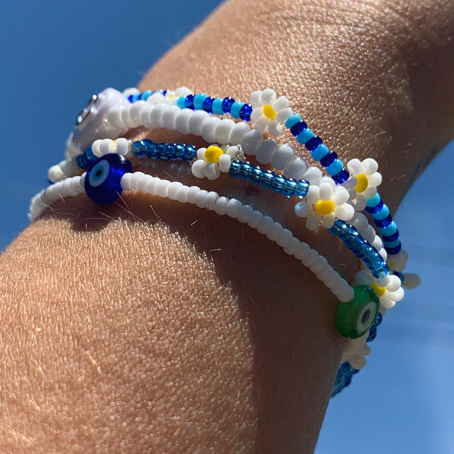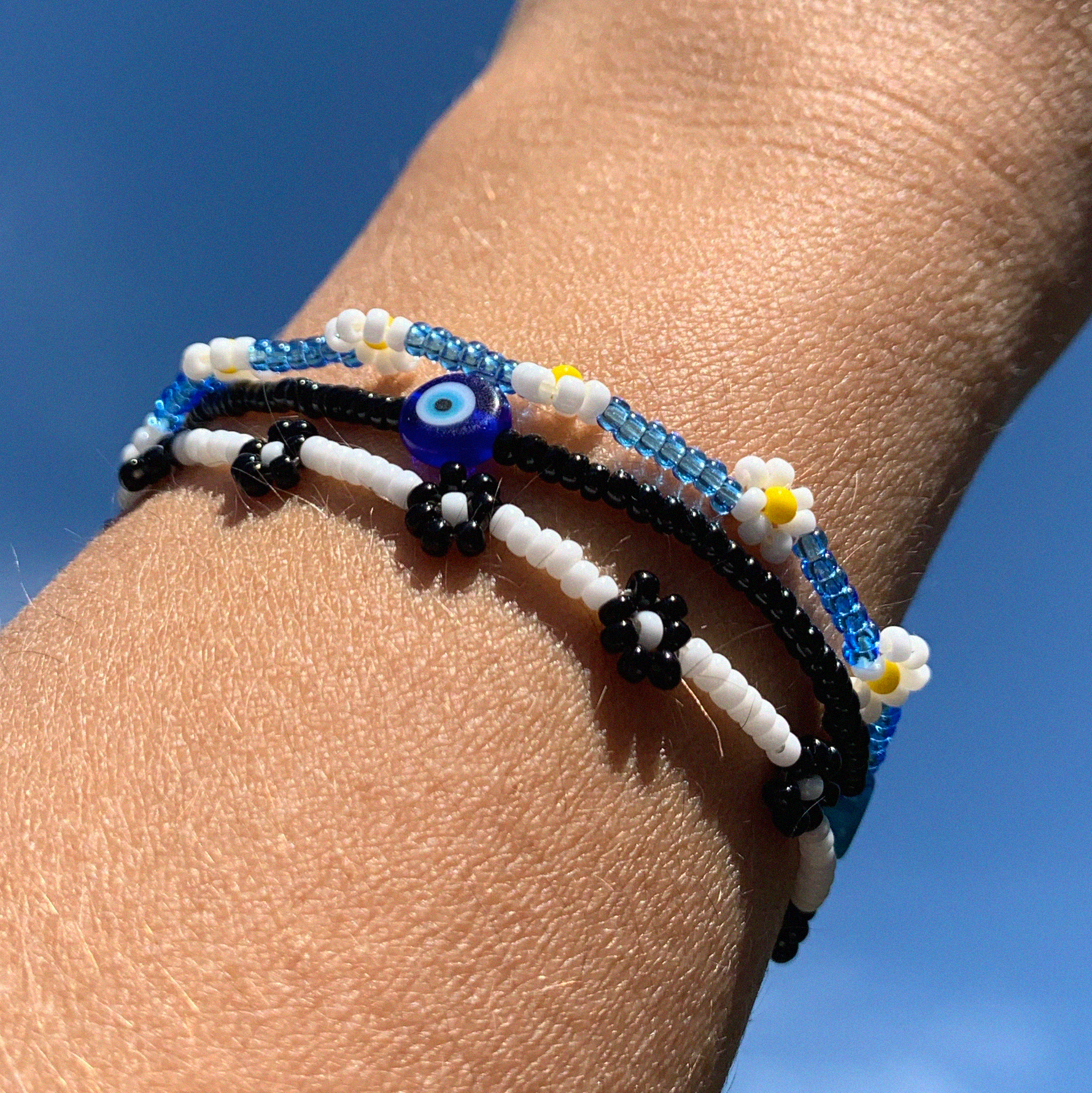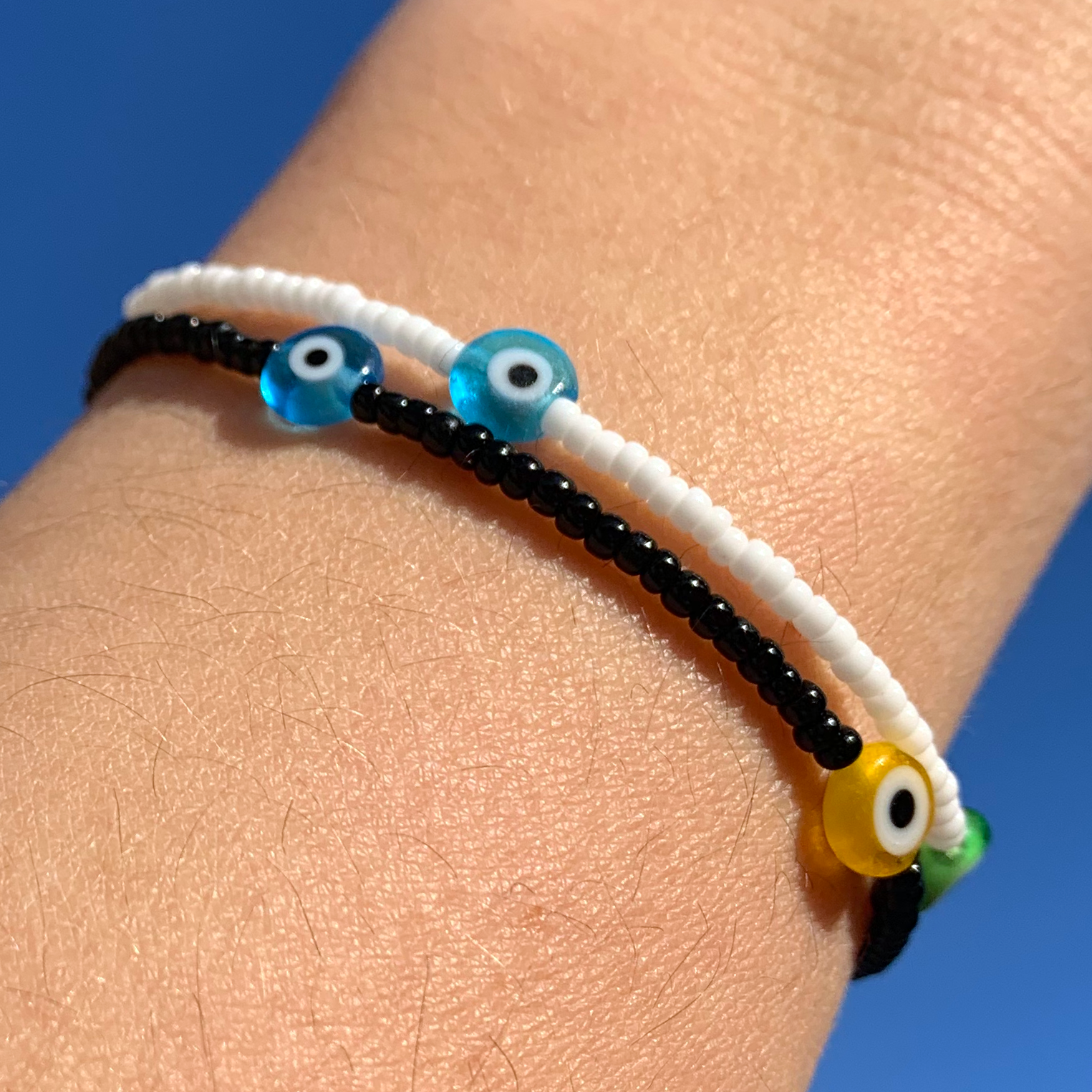 Choose from black or white glass seed bead chain color with glass Evil Eye beads. (Evil Eye Colors may vary!)