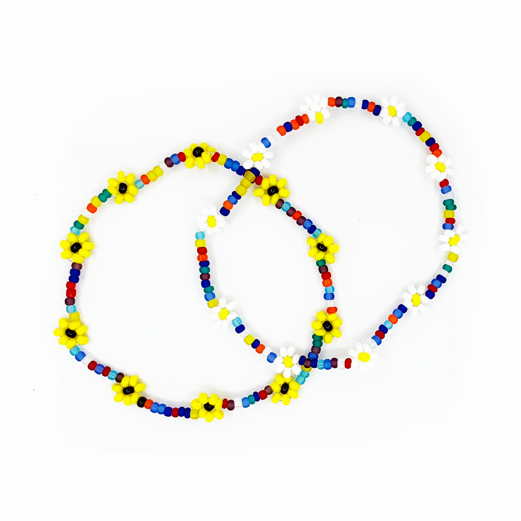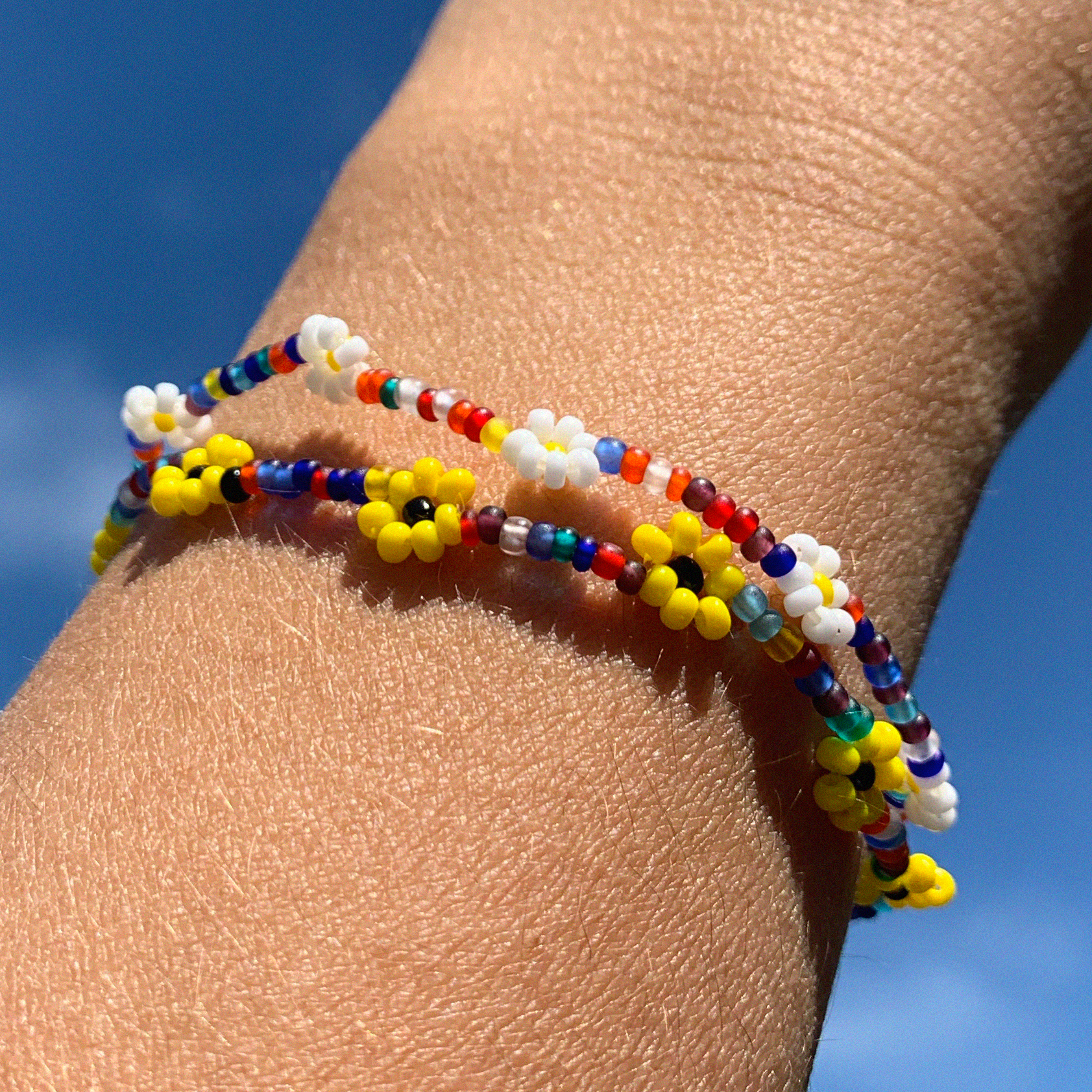 Handmade rainbow matte seed bead chain with daisies or sunflowers.