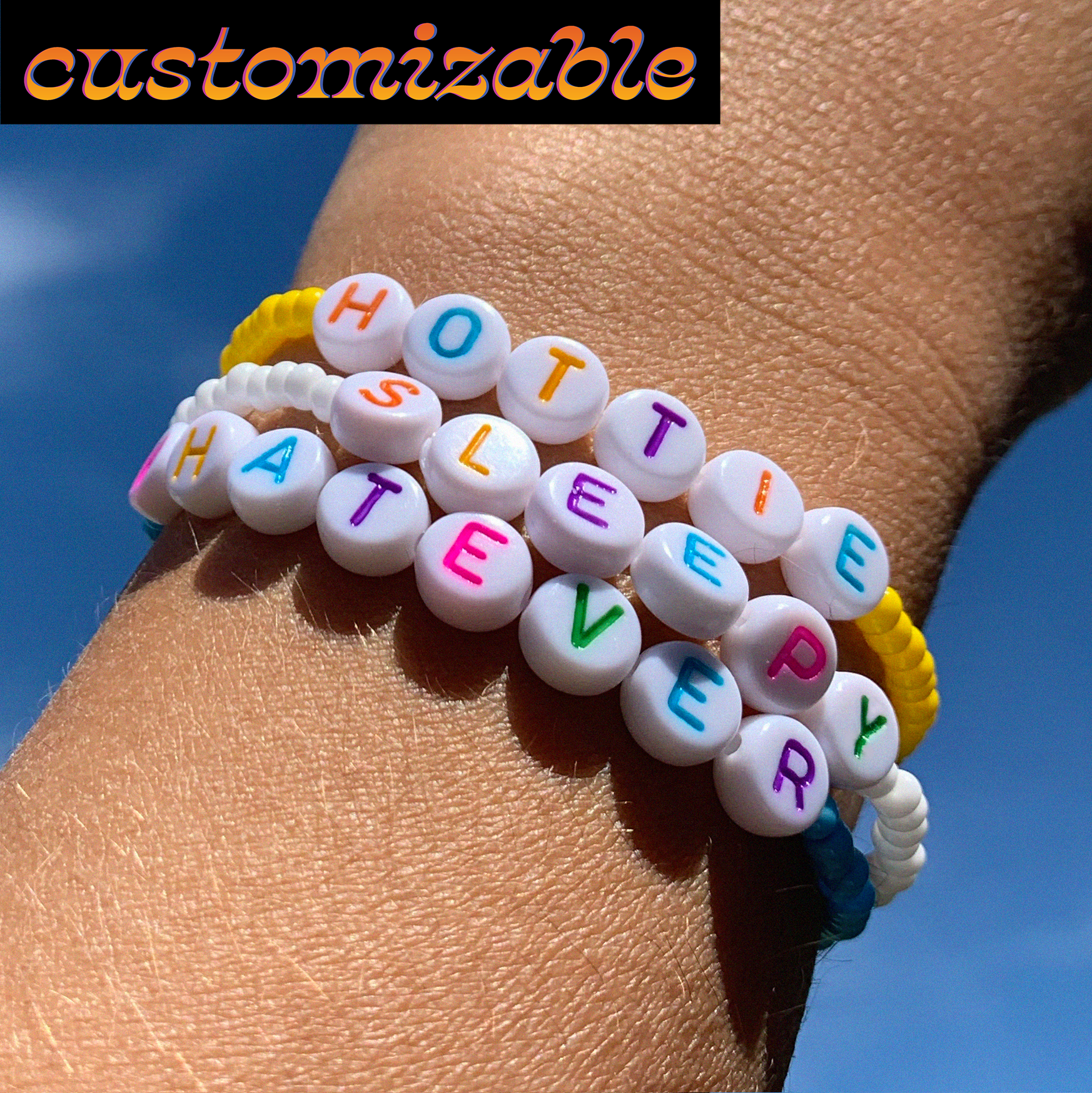 Handmade seed bead bracelet with colored custom text.