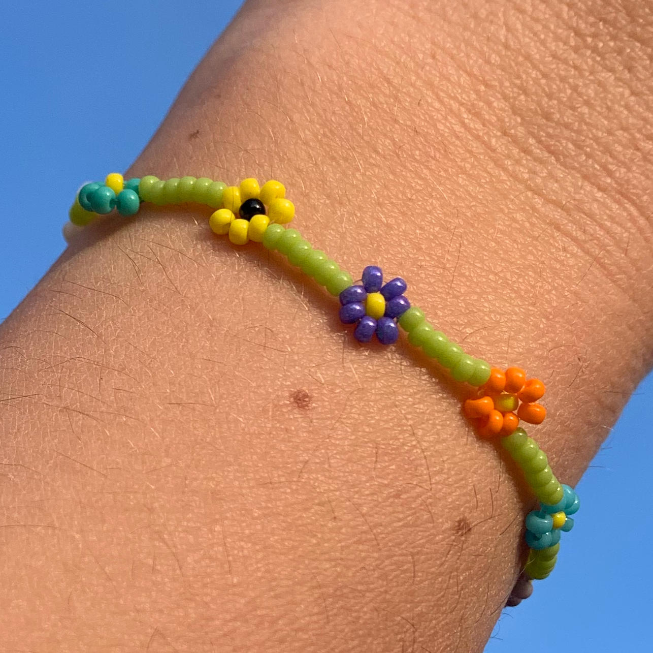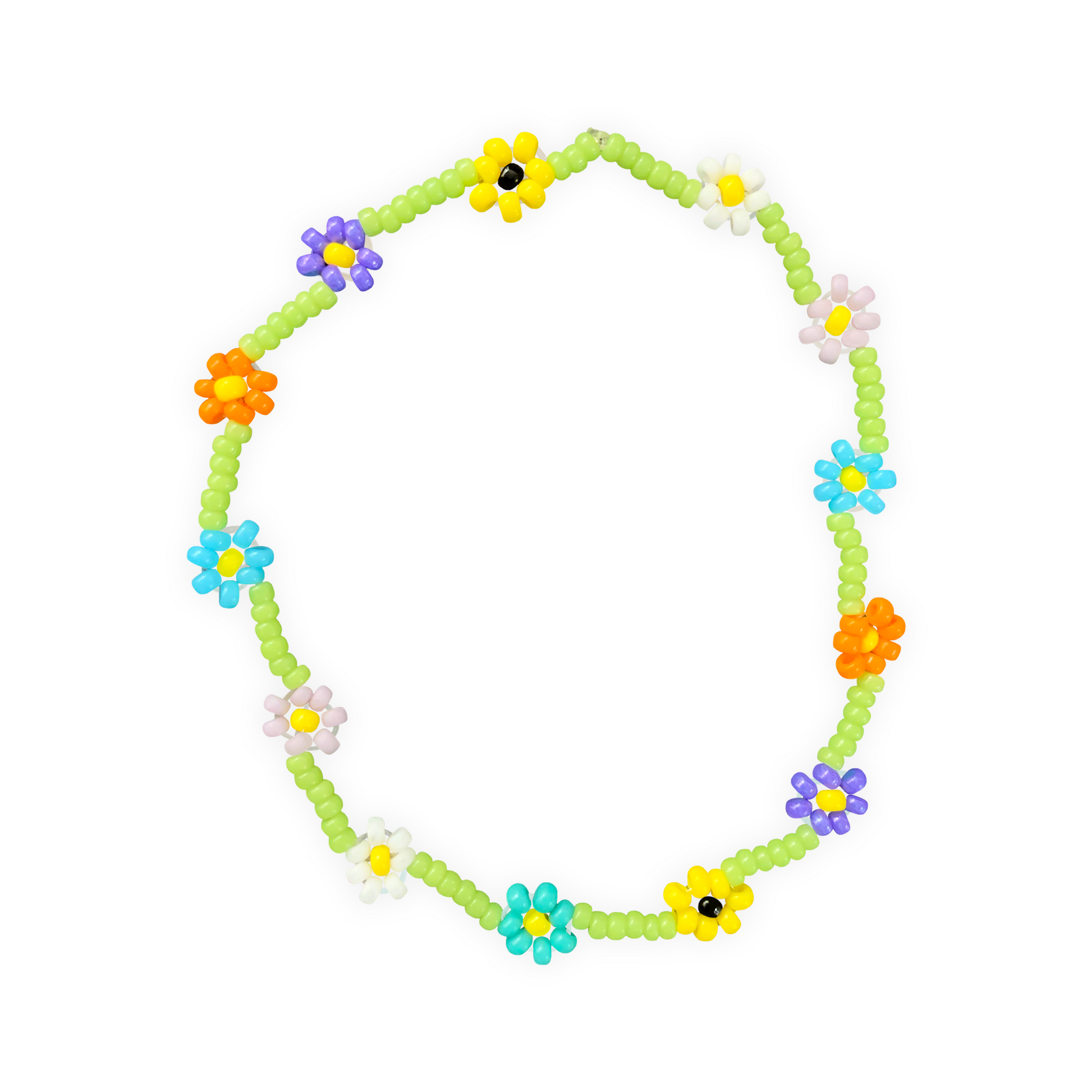 Green chain with purple, yellow, white, light purple, blue, orange and teal flowers.