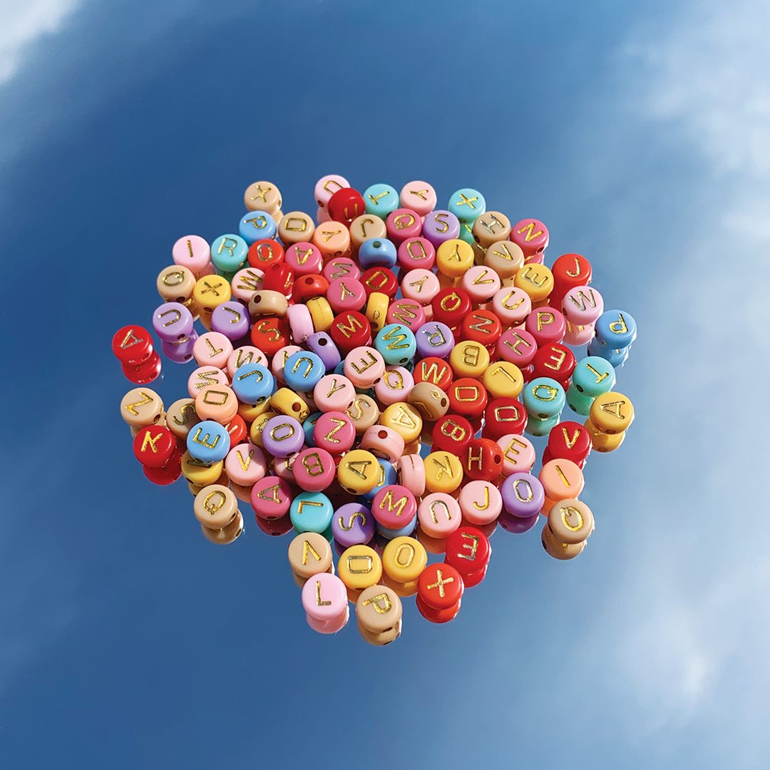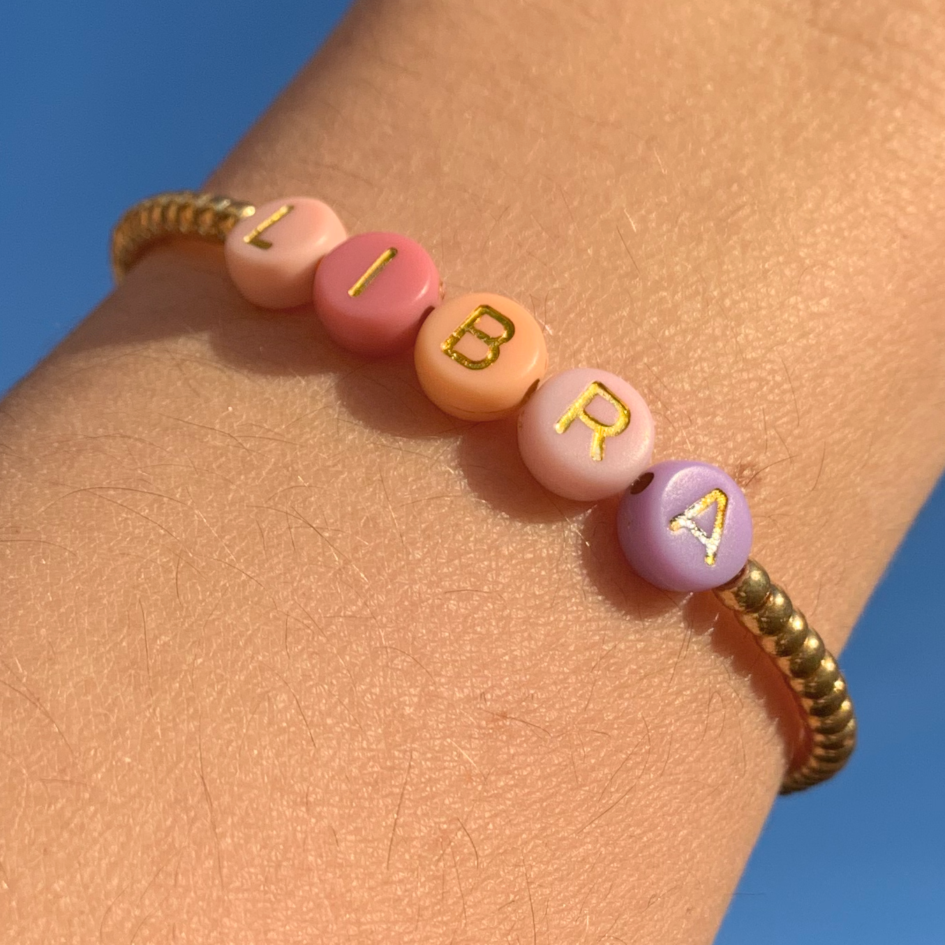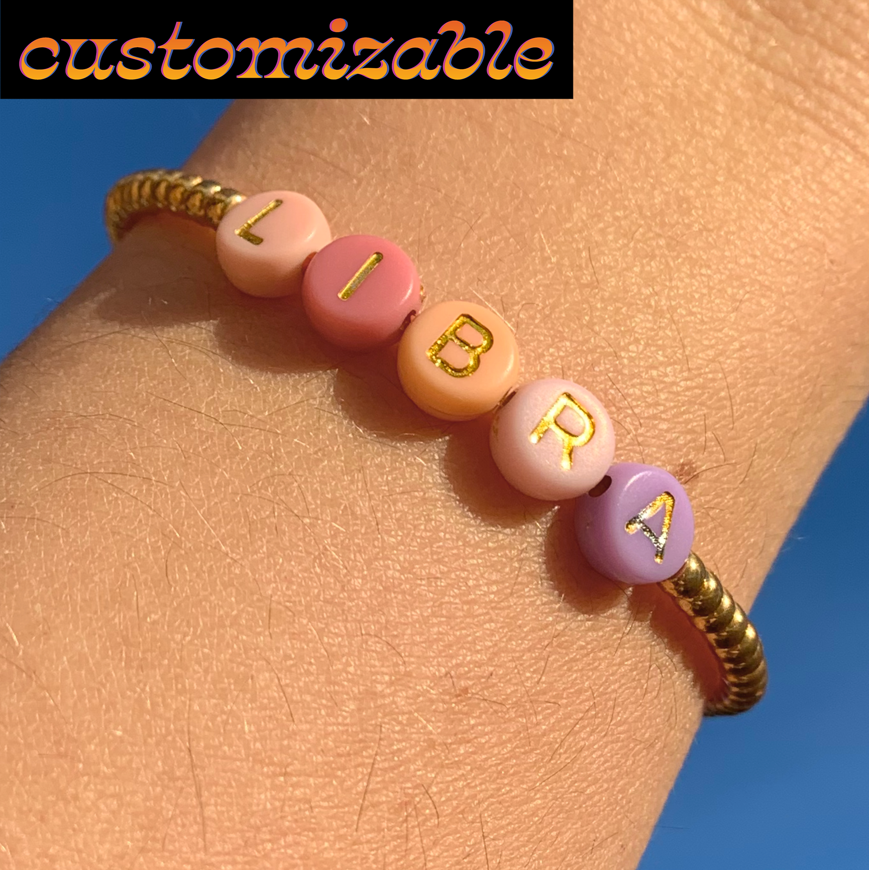Handmade gold seed bead bracelet with multi color gold letter custom text.